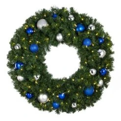 36″ Decorated Deluxe Oregon Fir Wreath – Lit with Warm White LEDs – Blue and Silver DécorNot Battery Operated.