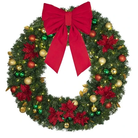 Download – 48″ Lit LED Warm White Decorated Wreath – Elegant Poinsettia – Bow Option Available