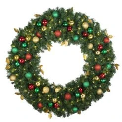 48″ LED Wreath Decorated, Traditional Décor• Not Battery Operated.• Fully lit and decorated straight out of the box.• Christmas Designers’ Traditional Décor consists of simple red, green and gold ornaments in shiny, matte and glitter finishes.• Low Energy Usage 5 mm wide angle conical lights for maximum illumination. Uses 90% less electric than traditional incandescent light sets.• LED Bulbs utilize 1 piece construction to prevent moisture from entering the bulbs. Each LED is rated for 75,000 hours of use.• Commercial quality wreath will look great for many years to come.• Perfect for indoor or outdoor use.• Thick, lush greenery for added realism.• Foldable Frame• Inner Frame Diameter: 28″• Outer Frame Diameter: 36″• Inner Greenery Diameter: 16″• Outer Greenery Diameter: 48″• Fluffed Greenery Diameter: 45″• Number of tips: 560• Number of bulbs: 200• Light Set Color: Warm White• Kelvin Temperature: 2800K• Lead Length: 6″• Case Weight: 15 Lbs.