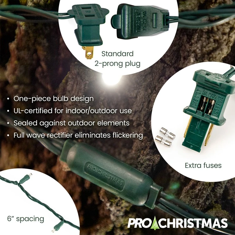 50 Light 2800K Standard Warm White 5 mm Wide Angle Conical LED Christmas Lights – BalledBrand: Pro Christmas™Bulb Style: 5 mm Wide Angle ConicalBulb Count: 50Bulb Color: 2800K Warm WhiteLight Set Series: Professional/Commercial GradeLight Set Action: DimmableBulb/Socket Design: One Piece, non removeable. Prevents dirt and moisture from damaging and corroding the lightingsystem.Bulb Life: 75,000 hrsBulb Spacing: 6″Bulb Dimensions: 1/4″ h x 3/16″ wSocket Dimensions: 11/16″ h x 5/16″ wOverall Dimensions: 15/16″ h x 5/16″ wWire Color: GreenWire Gauge: 22 GaugeRectifier: Full Wave Rectified – Specially designed inline, double injected molded – double sealed against the elements.Prevents bulbs from flickering during illumination.Light Set Length: 25’Lead Length: 6″Tail Length: 6″Connector Type: Non-Polarized End to End Connector – Up to 60 sets can be connected end to end and plugged into one extension cordor outlet.Plug Type: Non-Polarized Stackable, fused. Standard 2-prong plug. Works with any standard 110/120 volt outlet. No adapter required.UL Rated: Yes, for indoor or outdoor use.Watts Per Set: 3.45 WattsAmps Per Set: .04 AmpsVoltage: 120 VoltsMax # of Sets Connected Together: 60Warranty: 3 Season WarrantyCase Quantity: 24 *Note item sold individually.Case Weight: 17.6 lbs.