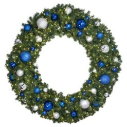 Be the first to review “72″ Lit LED Warm White Decorated Wreath – Blue And Silver Décor – Bow Option Available” Cancel reply