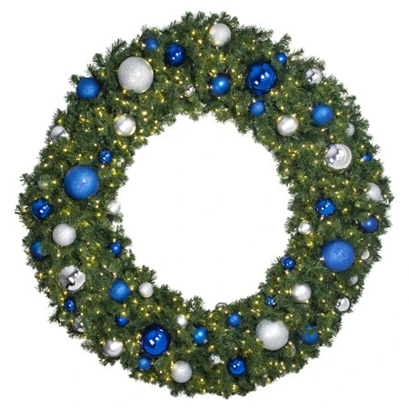 72″ Decorated Deluxe Oregon Fir Wreath – Lit with Warm White LEDs – Blue and Silver Décor• Not Battery Operated.• Fully lit straight out of the box• Low Energy Usage 5 mm wide angle conical lights for maximum illumination. Uses 90% less electric than traditional incandescent light sets.• LED Bulbs utilize 1 piece construction to prevent moisture from entering the bulbs. Each LED is rated for 75,000 hours of use.• Commercial quality wreath will look great for many years to come.• Perfect for indoor or outdoor use.• Thick, lush greenery for added realism.• Customize it by adding ribbons and/or ornaments• Number of tips: 1040• Number of bulbs: 600• Number of light sets: 12• Light Set Color: Warm White• Kelvin Temperature: 2800K• Lead Length: 6″