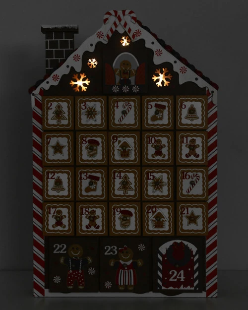 The traditional gingerbread calendar offers many small details. Different Christmas symbols are on the 24 doors. Sparkling snowflakes, a gingerbread man, his gingerbread woman and the sugar-sweet gingerbread decorations round off this calendar festively and make it a perfect gift in the run-up to Christmas.