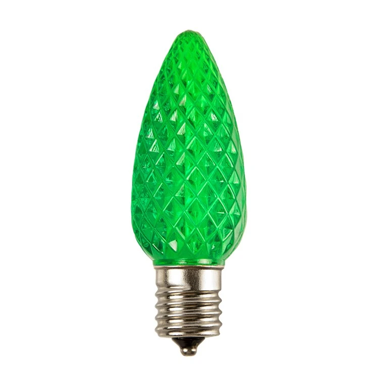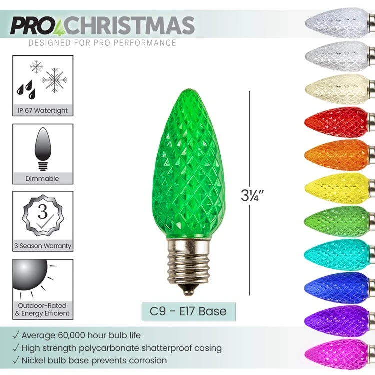 C9 LED SMD Retrofit Bulbs -Pro Christmas™ – Green – Bag of 25• Professional/Commercial Grade• Brand: Pro Christmas™• Bulb Design: C9, Faceted, high strength, impact resistant lens• Bulb Color: Green• Color Temperature: 515 Kelvin• Light Action: Steady; Dimmable• Base Size: Intermediate C9 / E17• Bulb Base: Nickel, prevents corrosion• Bulb Housing: High-strength polycarbonate with diamond facets for maximum illumination• Lumens: 17• Technology: 1 SMD LED with 4 embedded chips• Lens Height: 2 1/4″, Total Height 3 1/4″• Lens Diameter: 1 1/8″• Average Bulb life: 60,000 hours• Voltage: 120• Rated Watts: 0.8• Actual Watts: 0.5• IP Rating: IP 67• UL Rating: For Indoor/Outdoor Use• Warranty: 3 Seasons*• Case Quantity: 500 (20 bags) *Note item sold per bag• Case Weight: 20 lbs.