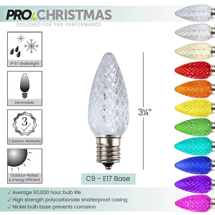 C9 LED SMD Retrofit Bulbs – Pro Christmas™ – Pure White – Bag of 25• Professional/Commercial Grade• Brand: Pro Christmas™• Bulb Design: C9, Faceted, high strength, impact resistant lens• Bulb Color: Pure White• Color Temperature: 4000 Kelvin• Light Action: Steady; Dimmable• Base Size: Intermediate C9 / E17• Bulb Base: Nickel, prevents corrosion• Bulb Housing: High-strength polycarbonate with diamond facets for maximum illumination• Technology: 1 SMD LED with 4 embedded chips• Lens Height: 2 1/4″, Total Height 3 1/4″• Lens Diameter: 1 1/8″• Average Bulb life: 60,000 hours• Voltage: 120• Rated Watts: 0.8• Actual Watts: 0.5• IP Rating: IP 67• UL Rating: For Indoor/Outdoor Use• Warranty: 3 Seasons*• Case Quantity: 500 (20 bags) *Note item sold per bag• Case Weight: 20 lbs.