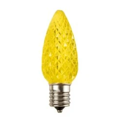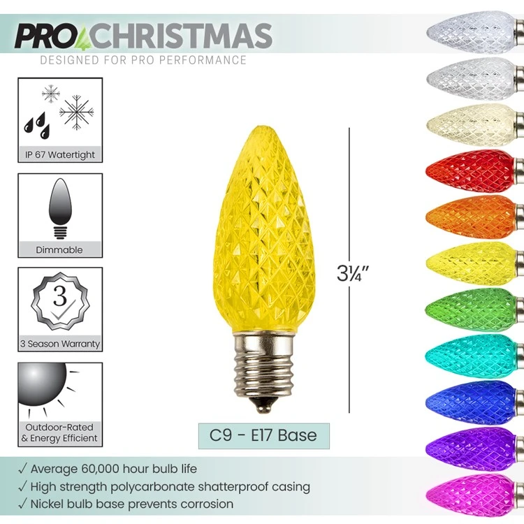 C9 LED SMD Retrofit Bulbs – Pro Christmas™ – Yellow – Bag of 25• Professional/Commercial Grade• Brand: Pro Christmas™• Bulb Design: C9, Faceted, high strength, impact resistant lens• Bulb Color: Yellow• Color Temperature: 585 Kelvin• Light Action: Steady; Dimmable• Base Size: Intermediate C9 / E17• Bulb Base: Nickel, prevents corrosion• Bulb Housing: High-strength polycarbonate with diamond facets for maximum illumination• Lumens: 24.5• Technology: 1 SMD LED with 4 embedded chips• Lens Height: 2 1/4″, Total Height 3 1/4″• Lens Diameter: 1 1/8″• Average Bulb life: 60,000 hours• Voltage: 120• Rated Watts: 0.8• Actual Watts: 0.5• IP Rating: IP 67• UL Rating: For Indoor/Outdoor Use• Warranty: 3 Seasons*• Case Quantity: 500 (20 bags) *Note item sold per bag• Case Weight: 20 lbs.