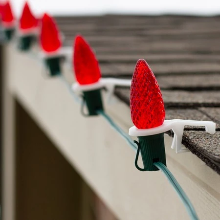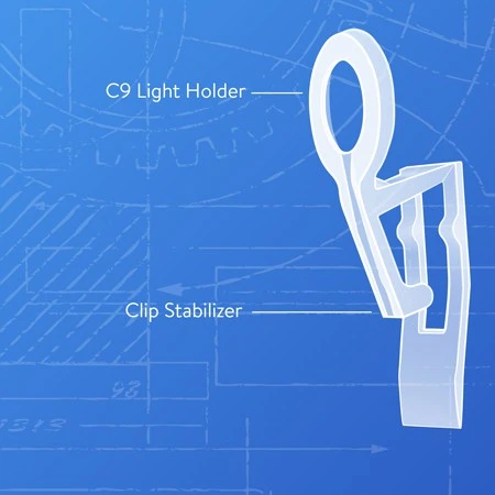 C9 Wedge Clip – Bag of 100 Wedge Clips is the top clip choice for pro Christmas installers. With Wedge Clips, you no longer have the issue of clips popping off perimeter light line, especially during removal. The clip is placed on the base of the bulb, before it’s screwed into the socket. This “sandwich style” design prevents the clip from coming off. Light line removal speed is decreased by up to 50% and clips left attached to the roofline after cord removal is no longer an issue. The fixed angle tail with contact pad helps the clip grip underneath the shingle for more stability.