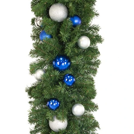 Decorated 9′ x 18″ Garland Unlit, Blue and Silver• Christmas Designers’ Blue and Silver of simple blue and silver ornaments in shiny, matte and glitter finishes makes this a festive choice.• Commercial quality garland will look great for many years to come.• Perfect for indoor or outdoor use.• Thick, lush greenery for added realism.• Number of tips: 560• Weight: ~15 Lbs.