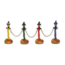 This colorful fencing set includes four vibrant posts, each topped with a witch’s hat and connected by spooky chains. Surrounded by autumn leaves, these playful yet eerie posts create boundaries for your haunted scene.