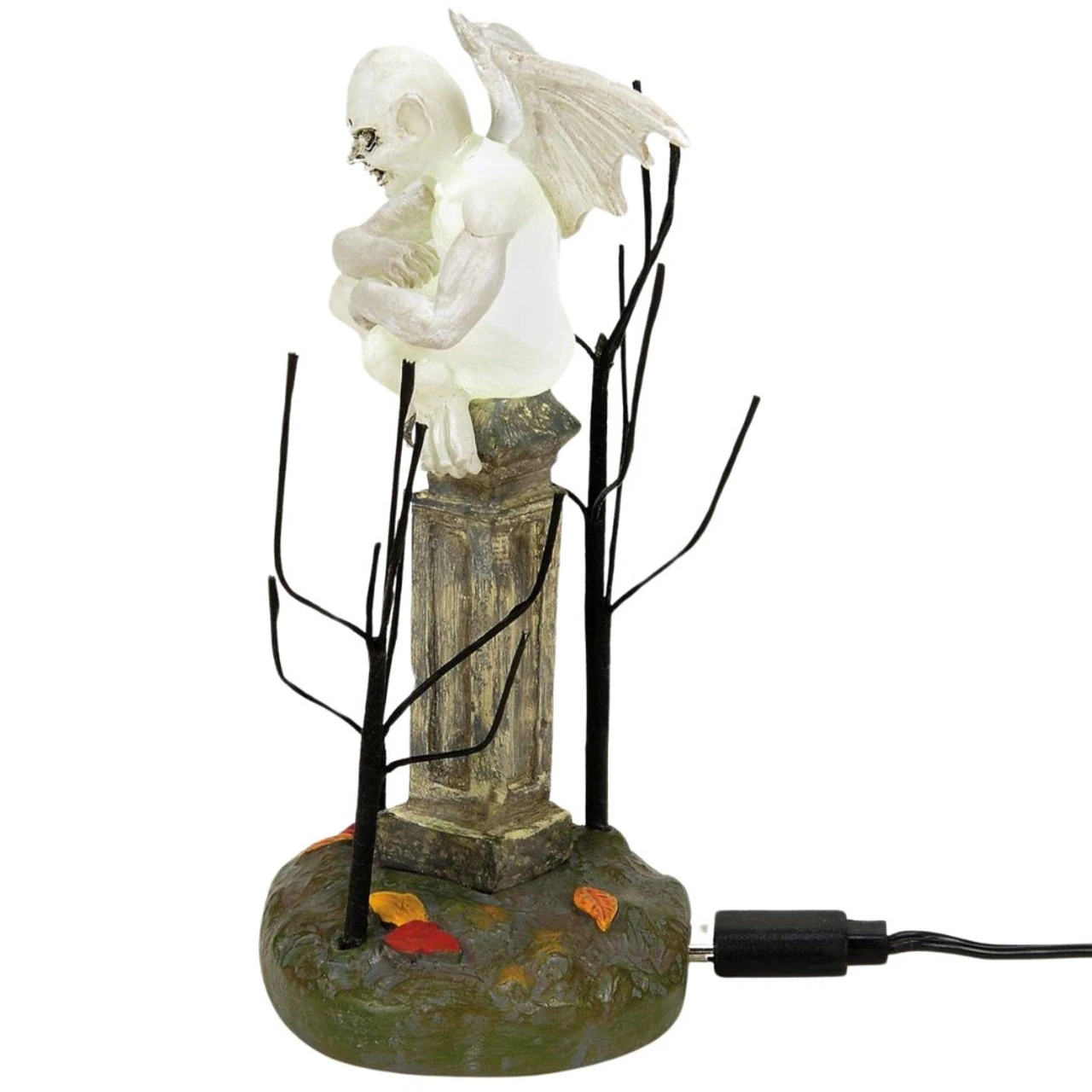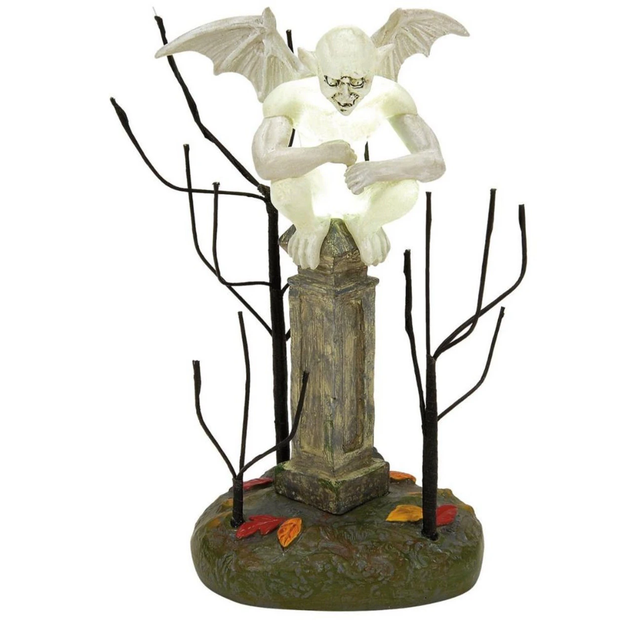 Add an eerie sentinel to your Halloween village with the Department 56 Gargoyle Watching Over The Graveyard. Perched atop a weathered pedestal, this haunting figure glows with an ominous light, casting shadows across the surrounding barren trees.
