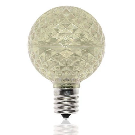 G50 SMD LED Retrofit Bulb – Sun Warm White – C9 Base -Minleon – Bag of 10• Professional/Commercial Grade• Brand: Minleon• Bulb Design: G50, Faceted, high strength, impact resistant lens• Bulb Color: Sun Warm White• Technology: 1 SMD LED with 3 embedded chips• Light Action: Steady; Dimmable• Color Temperature: 2600 Kelvin• Lumens: 24.7• Base Size: Intermediate Base – E17• Base: Nickel coated brass base prevents corrosion• Lens Height: 2 1/4″, Total Height: 3″• Lens Diameter: 2″• Volts: 120• Watts: .58• UL Rating: For Indoor/Outdoor Use• Case Quantity: 250 (25 bags)• Case Weight: 14.3 lbs.