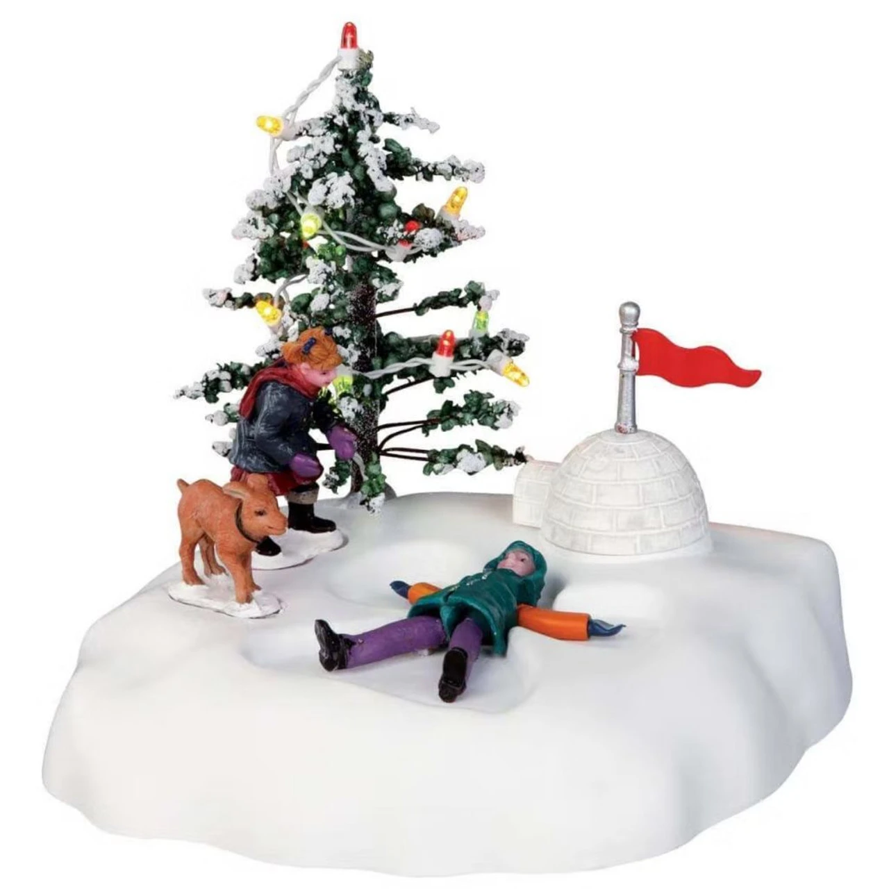 These kids are making the most of their snow day by making snow angels in the freshly fallen snow. Watch as the lights on the tree illuminate and the child’s arms and legs move back and forth.