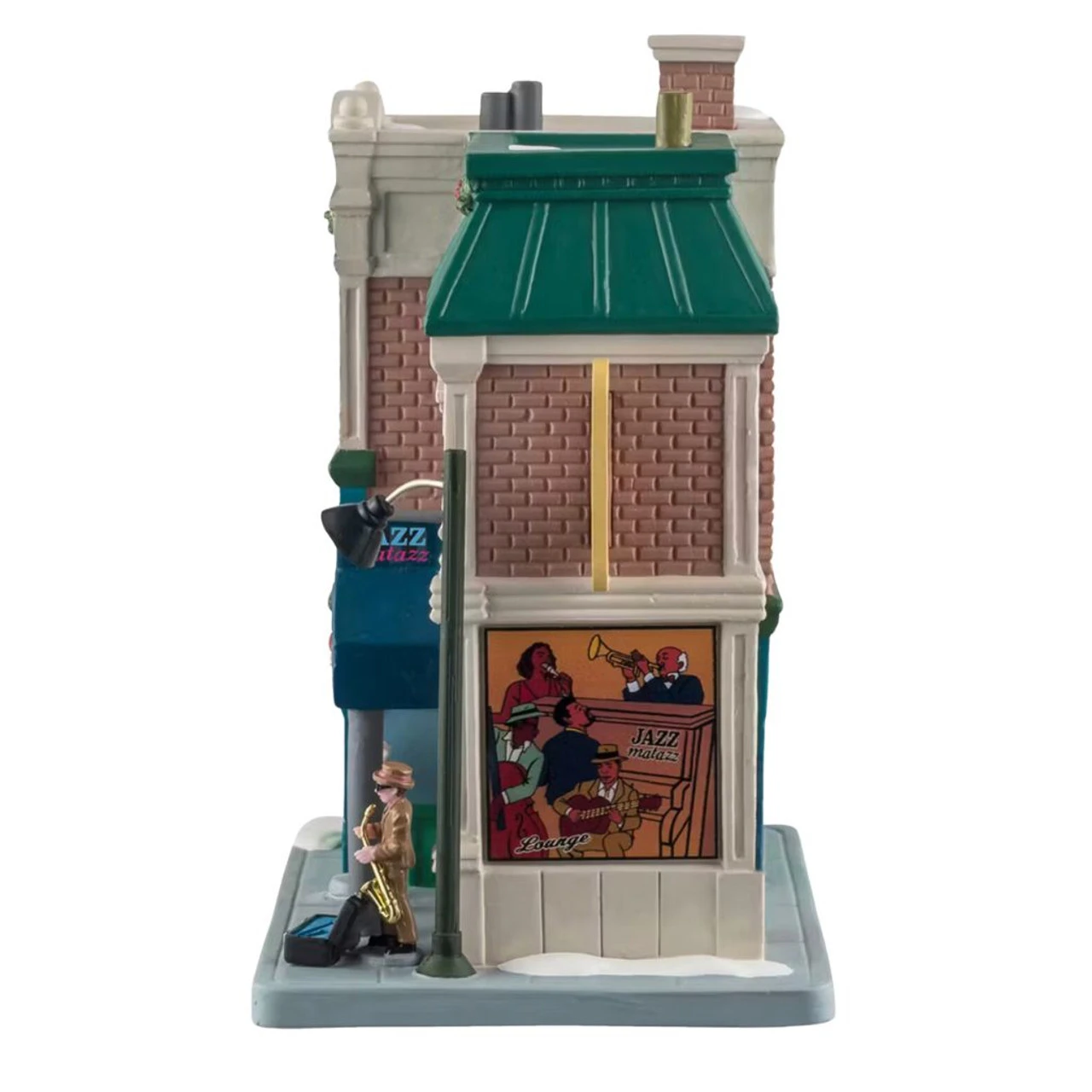 Swing into the rhythm of the holidays with Lemax Jazzmatazz Lounge. This vibrant, illuminated building features a live jazz performance scene, glowing windows, and festive wreaths. A saxophonist and guitarist add lively energy to this downtown-style lounge, making it a standout in any Christmas village.