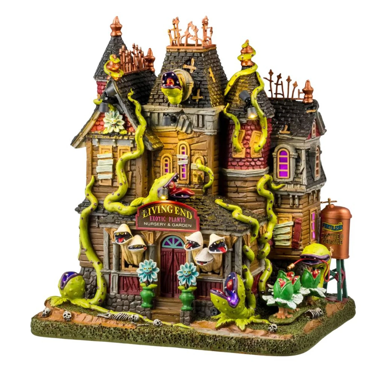 Welcome to Lemax Spooky Town’s The Living End, where exotic plants come alive—literally! This eerie nursery features monstrous vines, glowing lights, and carnivorous creations that are ready to bite. Its detailed design and vivid colors create a spine-chilling centerpiece for your Halloween village.