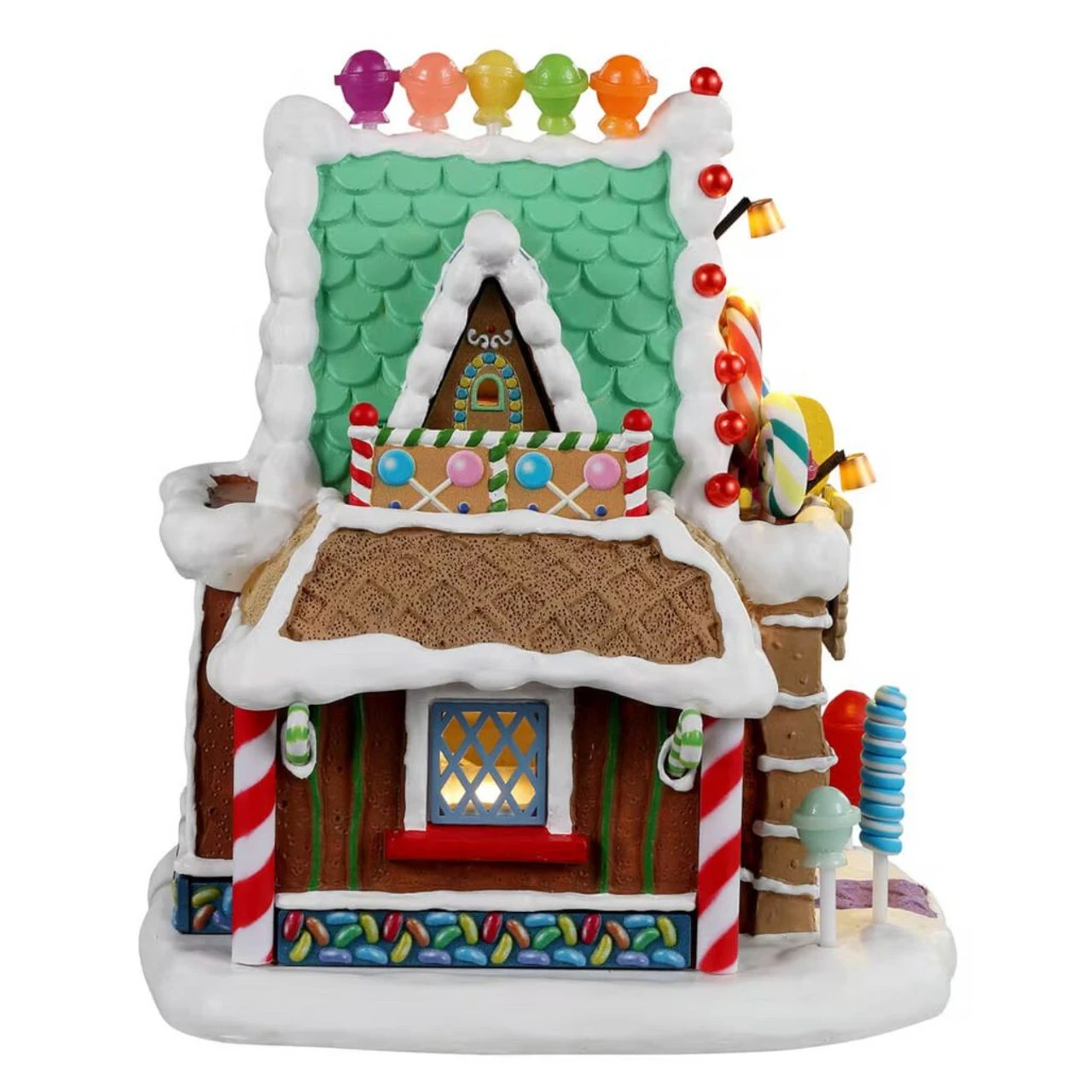 If you couldn’t guess by the brightly decorated exterior, this shop sells lollipops! Lollipops inside and out, lollipops on the roof, and lollipops out front. Swirly lollipops, round lollipops, and lollipops of all flavors, shapes, and sizes are sold at this sweet shop. Decorated and lit up for the holidays, the Lollipop Shop does a risk business filling stockings, hosting candy parties, and creating baskets for villagers with a sweet tooth. Outside, you can see two gingerbread people enjoying their recent purchases on the colorful candy stools.