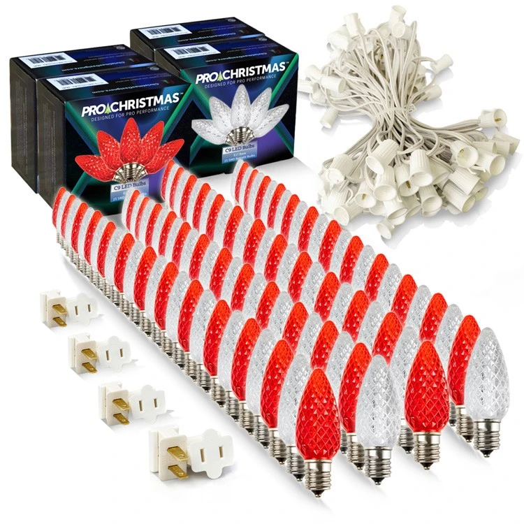 Light Line Kit – SPT-1 C9 100′ White Cord, 12″ spacing, 50 Pure White and 50 Red Bulbs, with 4 Male and 4 Female Slide on Plugs