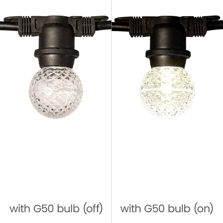 Medium Base Cord – 100′ – Black Cord – 24″ Spacing• Wire Color: Black• Wire Gauge: 16 AWG, 2 wire system• Spacing: 24″• Max Connection: 1• Total Length: 100’• Total Sockets: 50 Sockets• Connection: not end to end• Voltage Replacement Bulb: 25W Max per Socket• Maximum per run: 1250W• Usage: Indoor/Outdoor• Requires: E26 – Medium Base Bulbs • Case Quantity: 4• Case Weight: 36 lbs.• To add additional plugs:Female Patio PlugsMale Patio PlugsFemale Eagle Rubber Plugs
