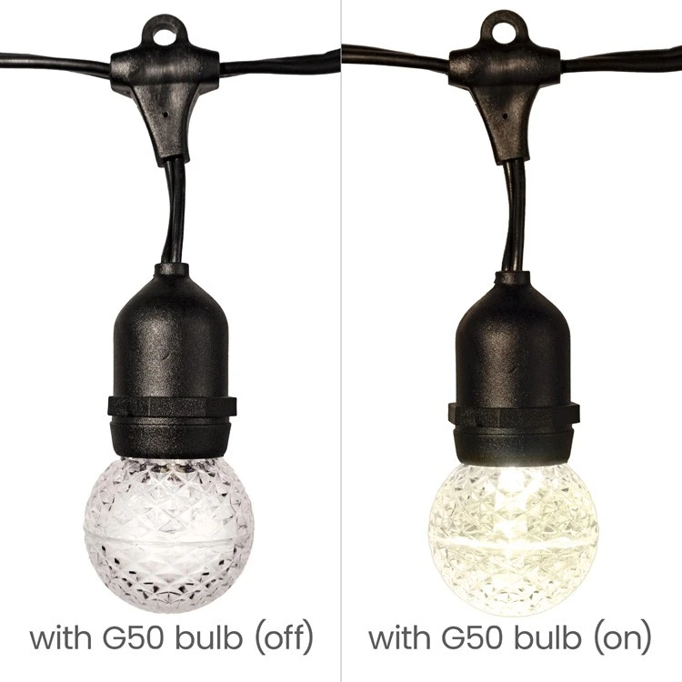 Medium Base Cord – 100′ – Black Cord – 24″ Spacing• Wire Color: Black• Wire Gauge: 16 AWG, 2 wire system• Spacing: 24″• Max Connection: 1• Total Length: 100’• Total Sockets: 50 Sockets• Connection: not end to end• Voltage Replacement Bulb: 25W Max per Socket• Maximum per run: 1250W• Usage: Indoor/Outdoor• Requires: E26 – Medium Base Bulbs • Case Quantity: 4• Case Weight: 44 lbs.• To add additional plugs:Female Patio PlugsMale Patio PlugsFemale Eagle Rubber Plugs