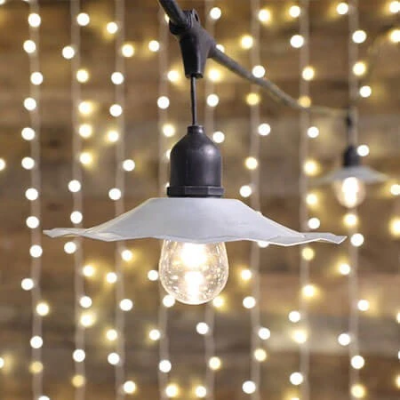 Medium Base Cord – Suspended – 48′ – Black Cord – 36″ Spacing• Wire Color: Black• Wire Gauge: 16 AWG, 2 wire system• Spacing: 36″• Total Sockets: 14• Max Connection: 1• Total Length: 48’• Total Shade Diameter: 8″• Lead Length: 60″• Connection: not end to end• Wire End: 12″• Voltage Replacement Bulb: 25W Max per Socket• Maximum per run: 1250W• Usage: Indoor/Outdoor• Requires: Medium Base Bulbs• To add additional plugs:Female Patio PlugsMale Patio PlugsFemale Eagle Rubber Plugs