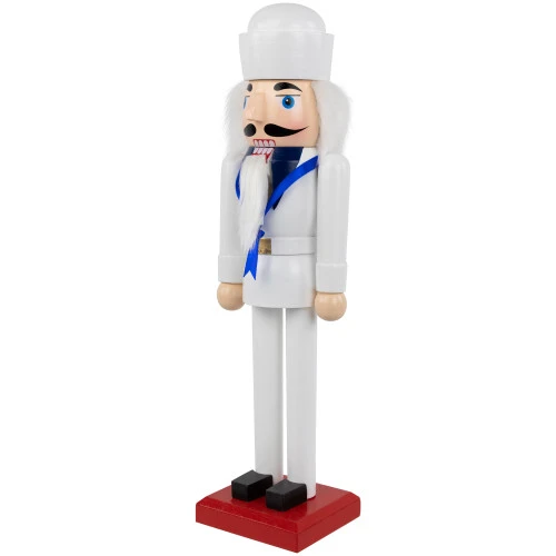 Stands at attention, wearing traditional dress whites with a blue tie and white cap