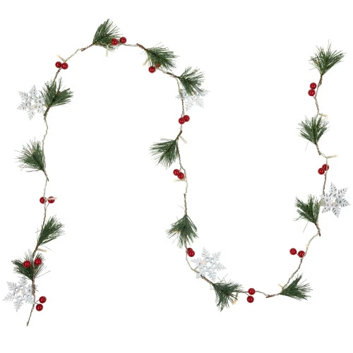 Holly berries, pine sprigs, and metal snowflakes
