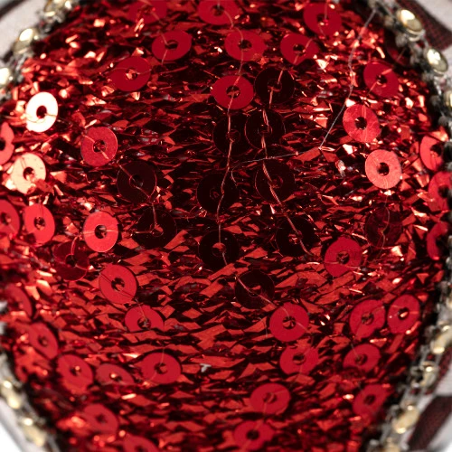 Teardrop design accented with red sequins and metallic red and white checkered patterns