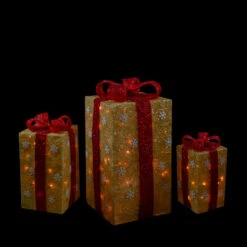 Northlight Set Of 3 Lighted Tall Gold Gift Boxes With Red Bows Christmas Outdoor Decorations 18″