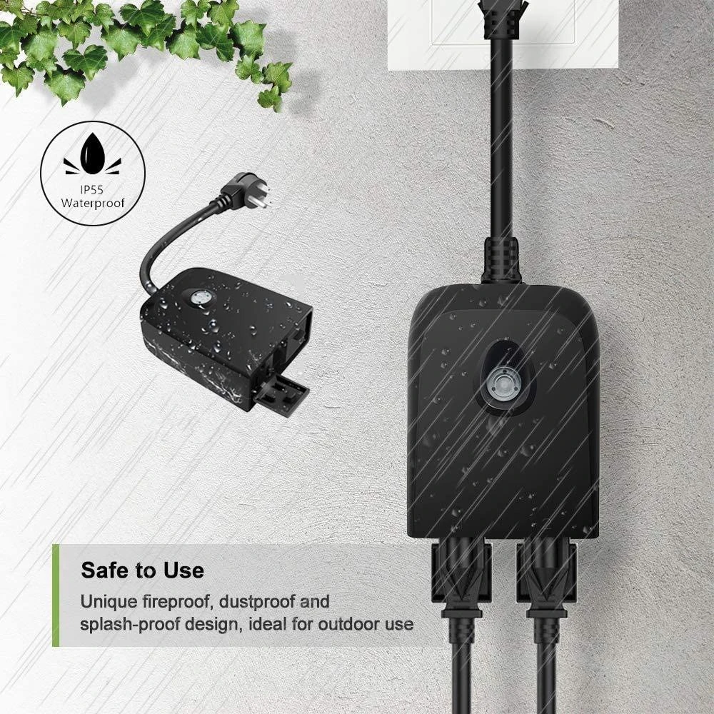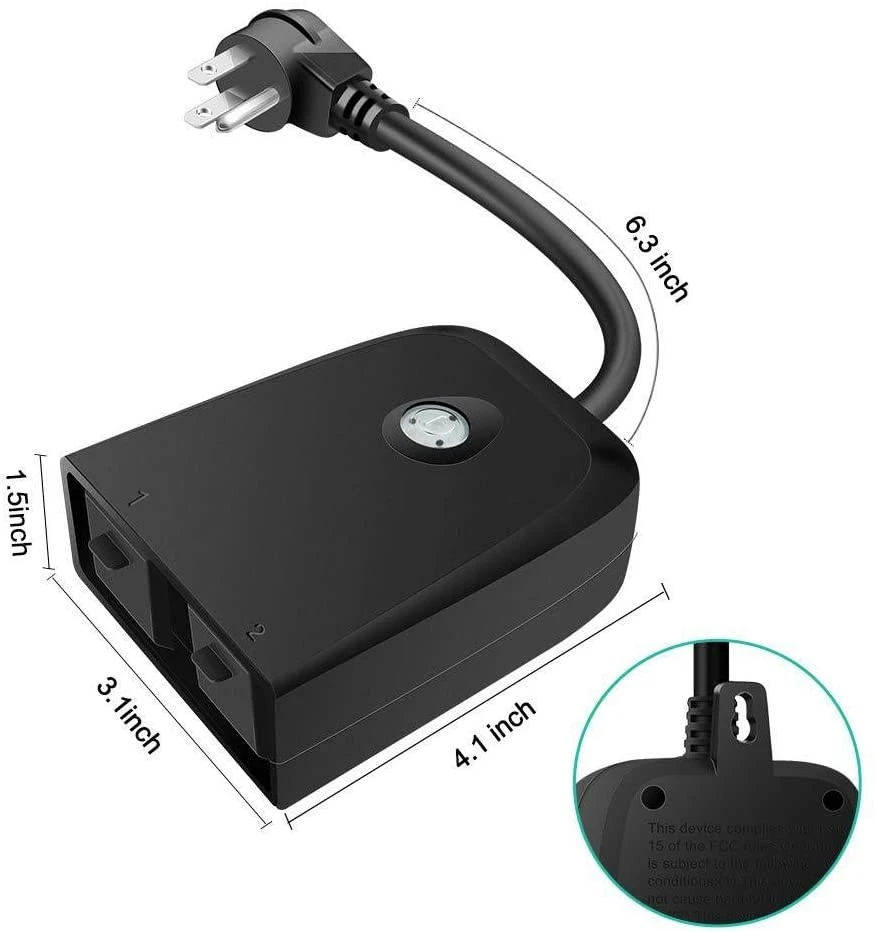 WIFI App Controlled Timer• Use smartphone Voice Control App or remote to control your devices from any location. • Control both IP55 waterproof sockets independently. • Ability to set multi-schedule timing by setting daily schedules or event control according to various scenes. Features an energy monitoring function to help lower your electric bill. • Rated 16A maximum and FCC ET listed• Built-in overcurrent protector, surge protector, and ABS fireproof case to help eliminate power surges and overheating.• Connect timer to WiFi, no extra hub, or any paid subscription service needed, user friendly.• ABS Wattage: 2000 watts